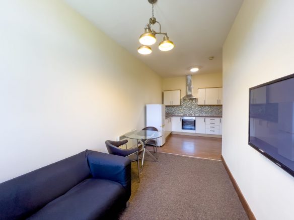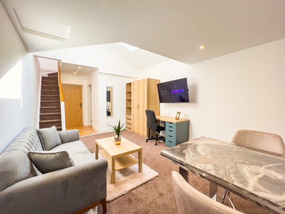 This apartment is fully furnished with large sofas, coffee table and a wall-mounted TV. Each bedroom comes with a double bed, bedside drawers, study desk and chair, wardrobe. The apartment has a fully fitted kitchen and the main bathroom which come with a fully tiled bath area, hand basin, toilet and a heated towel radiator.