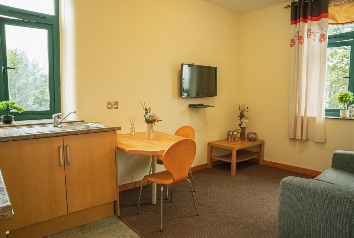 This apartment is fully furnished with a sofa, coffee table, dining table and chairs and a wall mounted T.V. The bedroom comes with a double bed, bedside drawers, study desk and chair and a wardrobe. The en-suite bathroom comes with a fully tiled shower cubicle, hand basin, toilet and a heated towel radiator.
